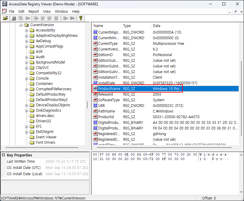 ⑤ [Structure] 탭 → SOFTWARE 레지스트리 → Windows 카테고리에서 윈도우 운영체제의 제품명(ProductName)을 확인한다.