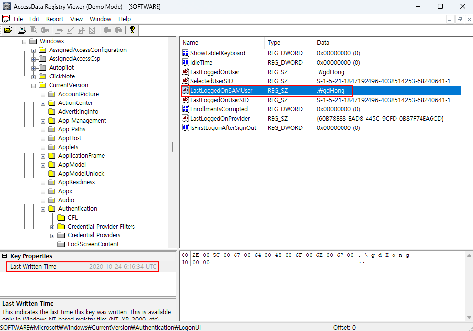 ⑥ [Structure] 탭 → SOFTWARE 레지스트리 → Windows 카테고리에서 마지막으로 로그인한 사용자의 이름(LastLoggedOnSAMUser)을 확인한다.