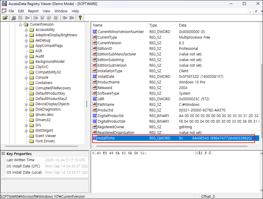 ④ [Structure] 탭 → SOFTWARE 레지스트리 → Windows 카테고리에서 운영체제 설치 일자(InstallDate)를 확인한다.