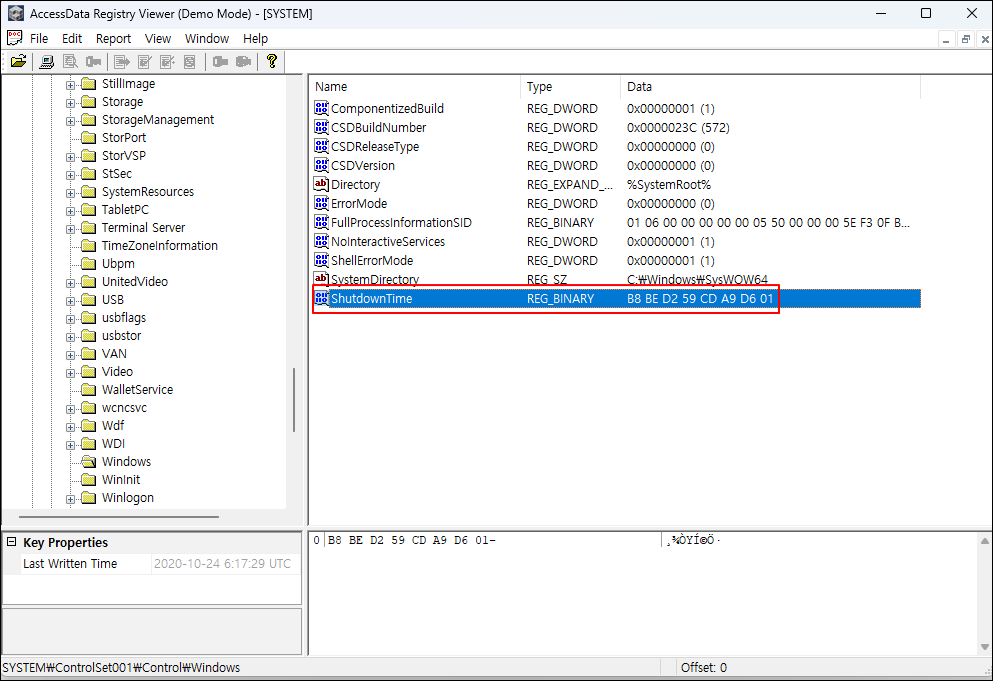 ② [Structure] 탭 → SYSTEM 레지스트리 → Windows 카테고리에서 마지막 종료 시각(ShutdownTime)을 확인한다.