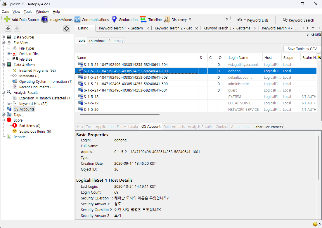 ① SAM 레지스트리에서 gdHong의 V값을 찾아, AutoPsy에 추가된 SID와 비교한다.