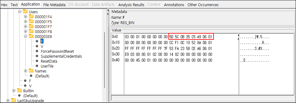 ② SAM 레지스트리의 F값에서 마지막으로 로그온 한 일시를 확인한다.