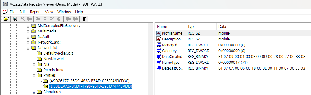 ② SOFTWARE 레지스트리에서 NetworkList > Profiles 아래 유무선 네트워크 카드의 GUID를 찾아보고 네트워크 공유기의 IP와 프로 파일명을 확인한다.