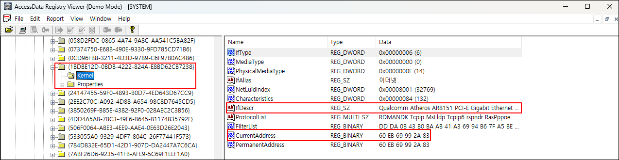 ③ SYSTEM 레지스트리에서 HardwareConfig 키를 찾아 유선 네트워크 카드의 MAC 주소를 확인한다.