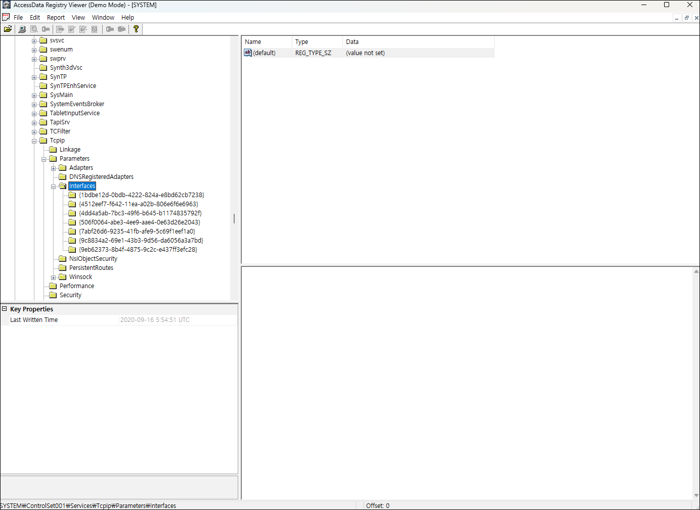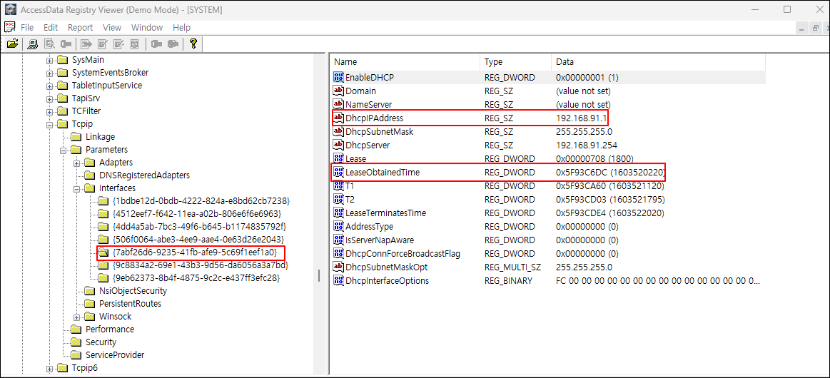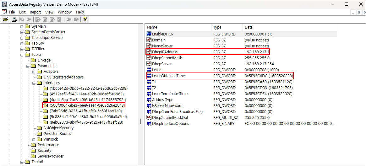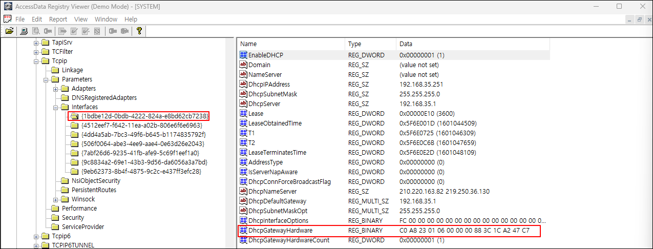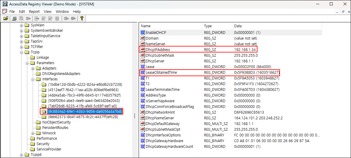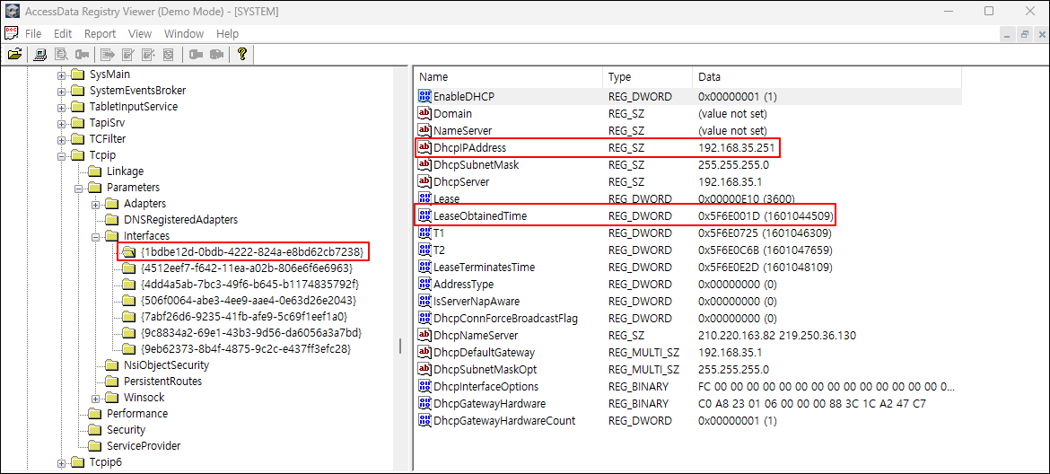 ① SYSTEM 레지스트리에서 Tcpip > Parameters > Interfaces 키를 찾아, 네트워크 카드의 개수, 유선 네트워크 카드의 제품명 및 GUID, 무선 네트워크 카드의 제품명 및 GUID, 할당된 IP, 할당 일시 등을 확인한다.