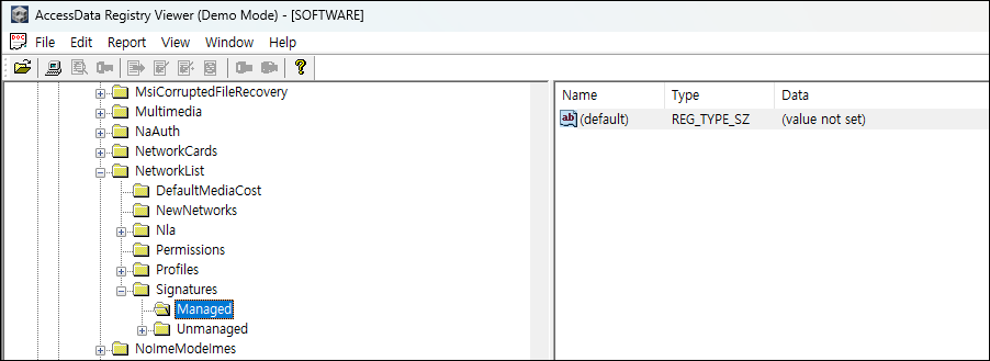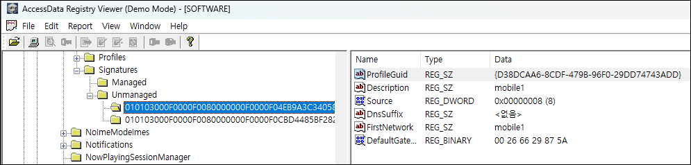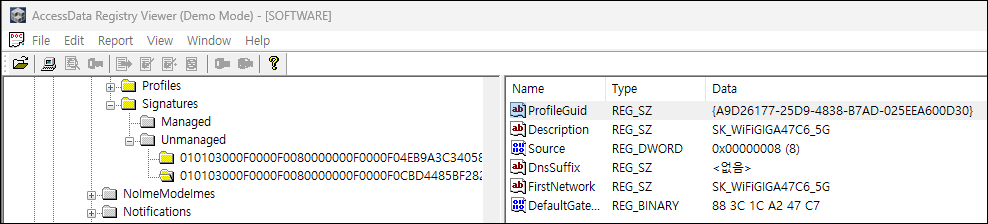 ③ SOFTWARE 레지스트리에서 NetworkList > Signatures 아래 Managed, Unmanaged 키를 찾아보고 연결된 네트워크 공유기의 MAC 주소를 확인한다.