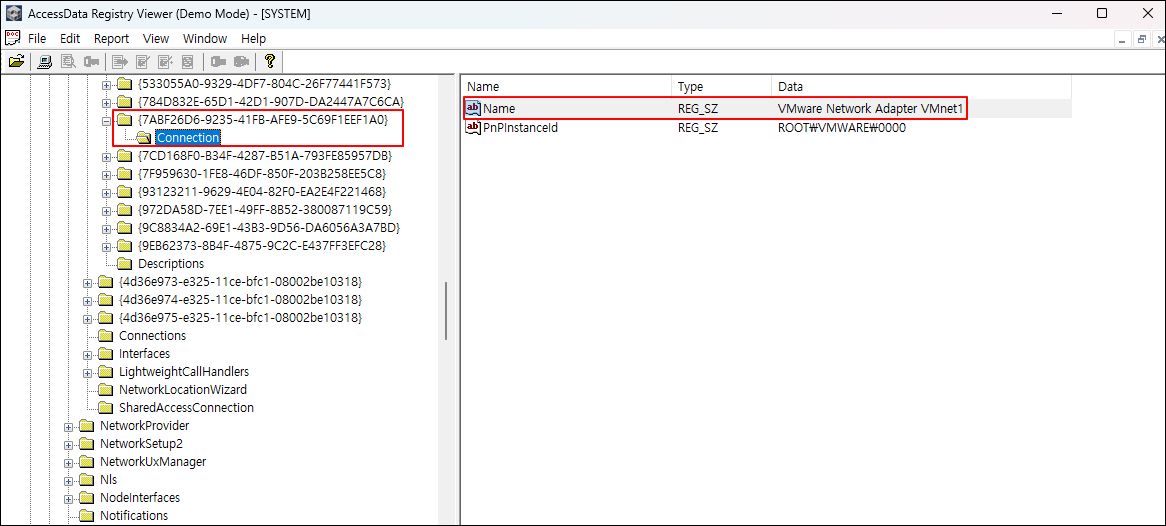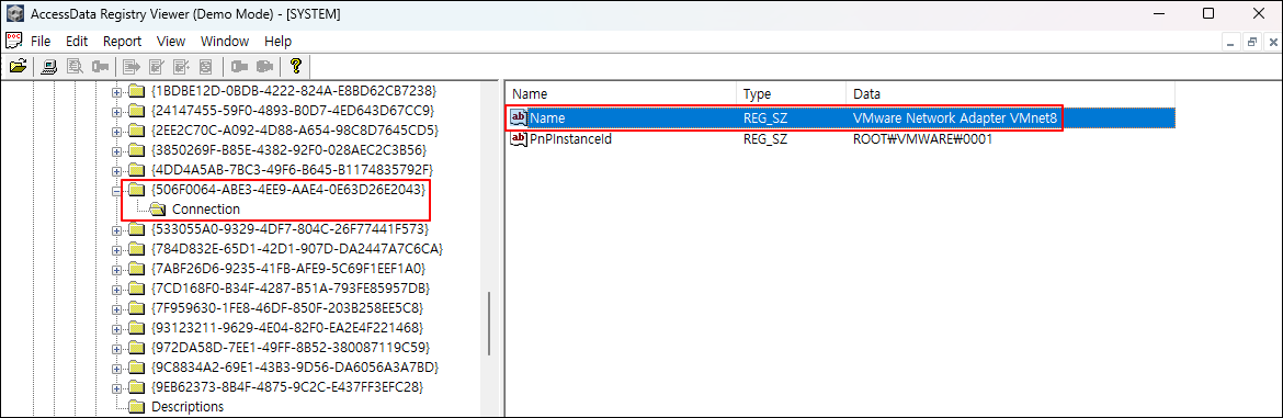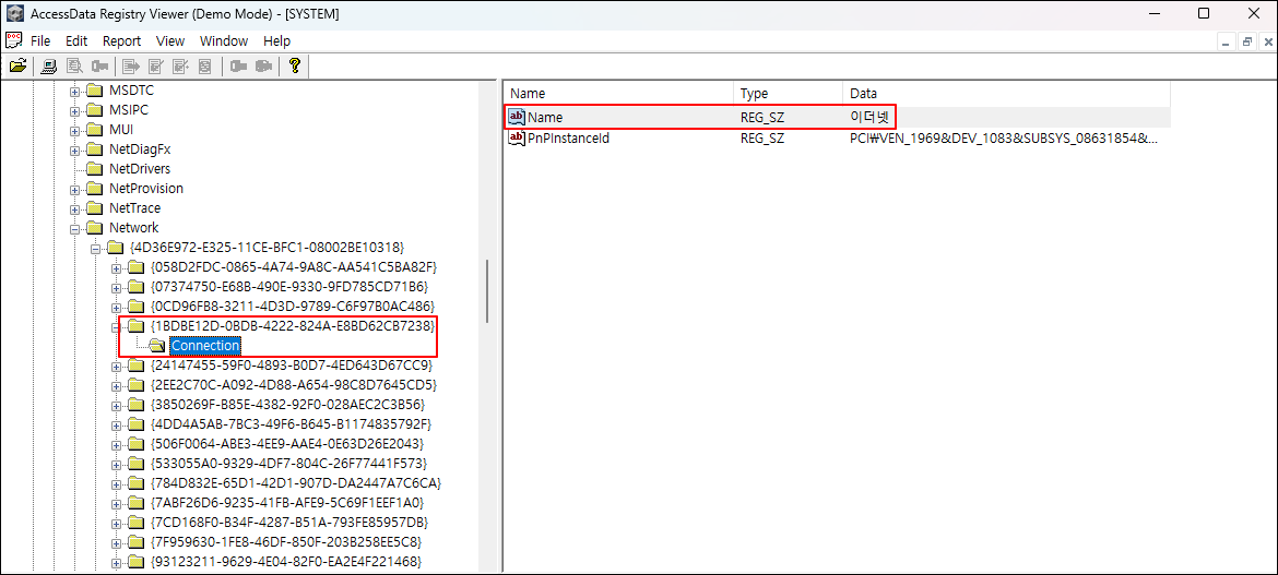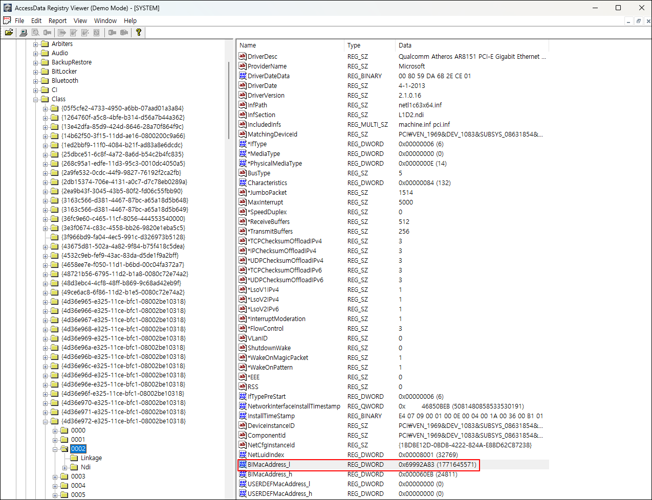 ② SYSTEM 레지스트리에서 {4d36e972-e325-11ce-bfc1-08002be10318} 키를 찾아 유선 네트워크 카드의 MAC 주소를 확인한다.