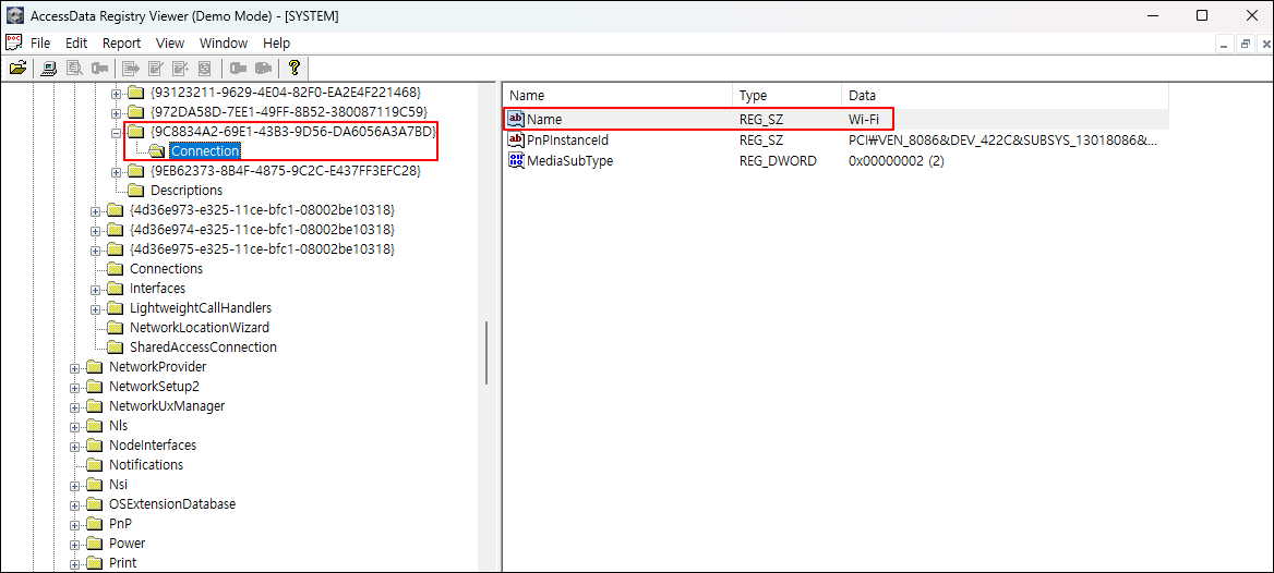 ④ SYSTEM 레지스트리에서 NetworkSetup2\Interfaces 키를 찾아 유무선 네트워크 카드의 MAC 주소를 확인한다.