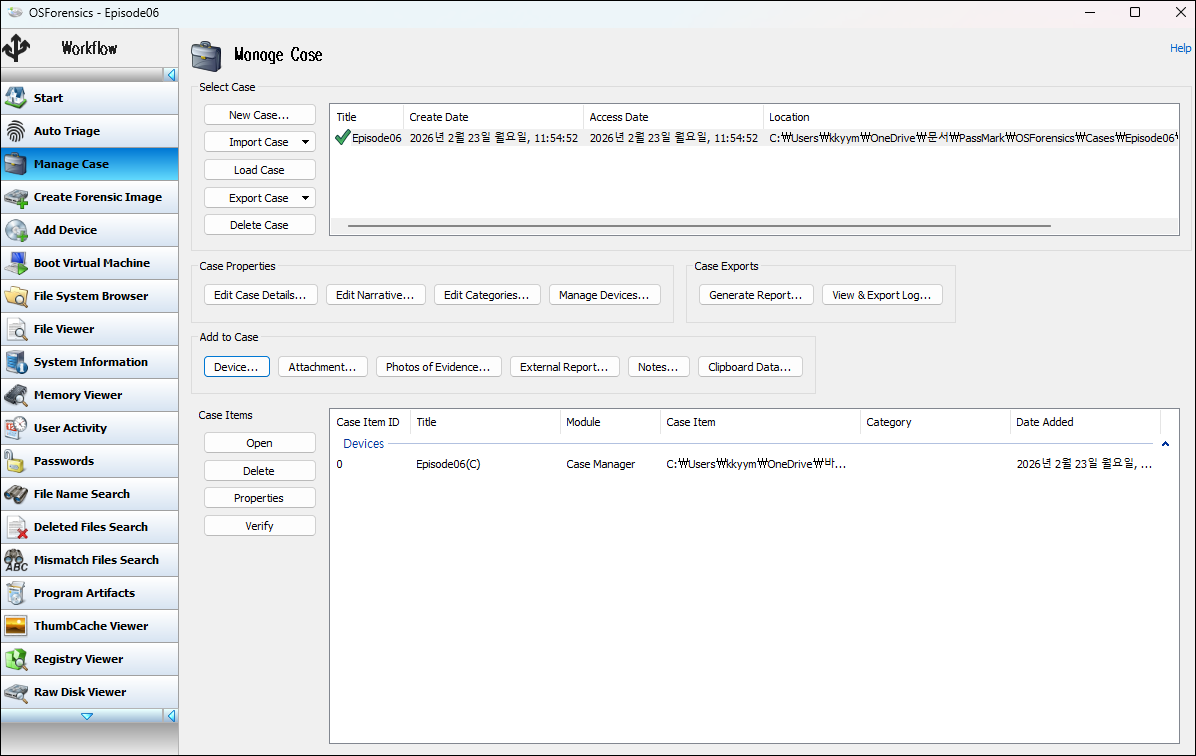4. OSForensics 프로그램을 실행하고, Case를 만들고, 위 Export 된 폴더를 추가한다. (또는 'Episode06.L01' 이미지 파일을 추가한다)