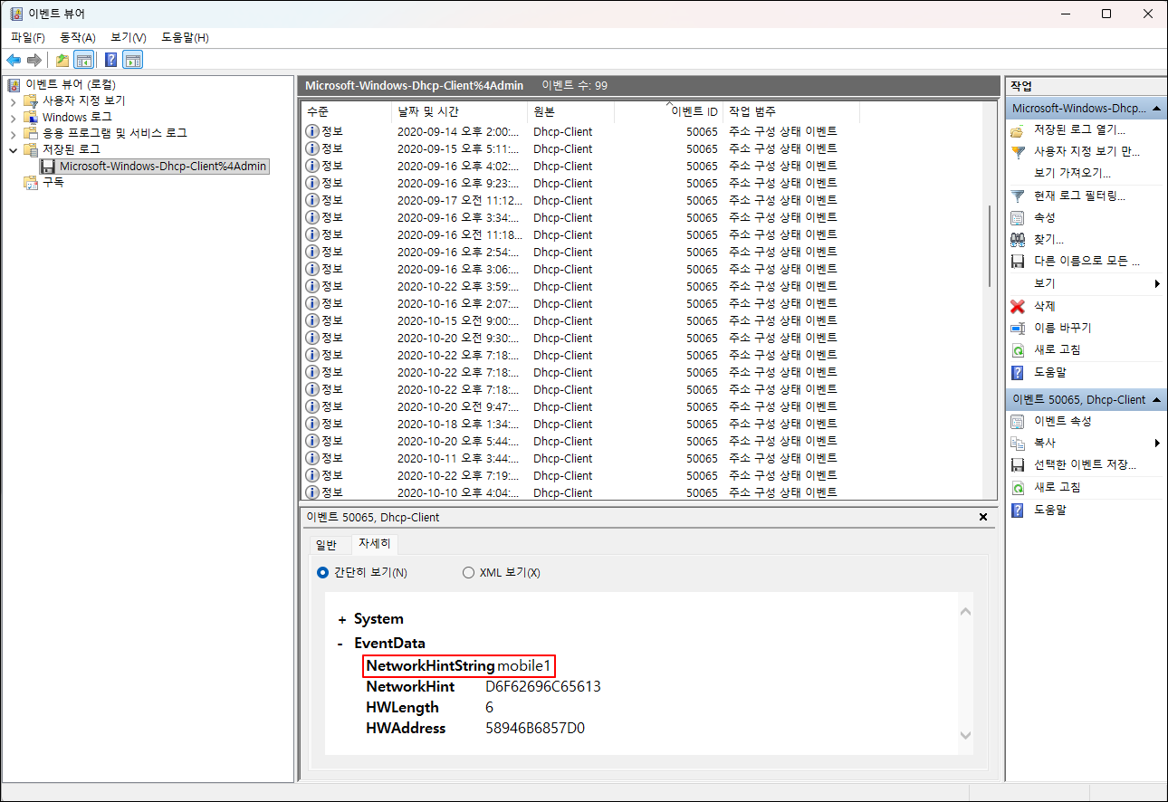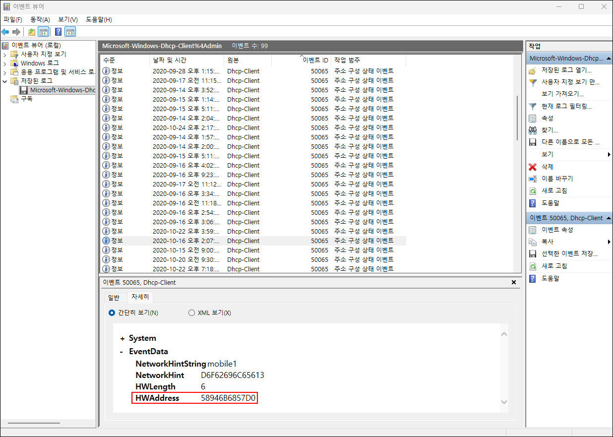 ② Microsoft-Windows-Dhcp-Client 이벤트 로그를 찾아서 우측 마우스를 클릭한 후 [Open (Default Program)] 선택하면 '이벤트 뷰어'가 열리고, 그곳에서 분석 대상 컴퓨터의 무선 네트워크 카드의 MAC 주소를 확인한다.