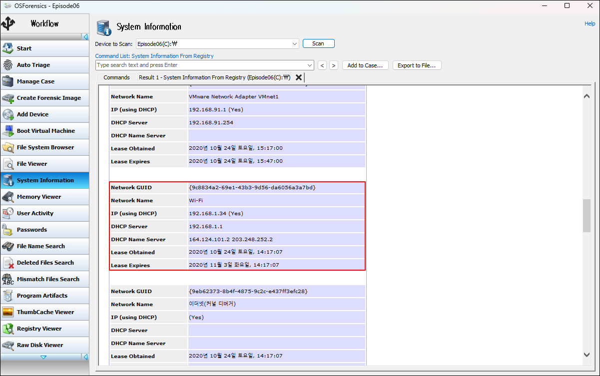 ② [Artifacts] ⇒ [Overview] ⇒ [Network] ⇒ [TCP/IP Configuration]에서 IP 주소와 할당 날짜 등을 확인하고, 데이터의 출처를 파악한다.
