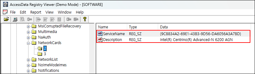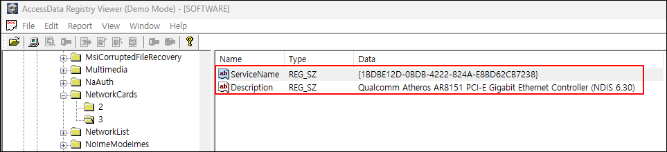 ① SOFTWARE 레지스트리에서 CurrentVersion > Networkcards 아래에서 유무선 네트워크 카드의 GUID를 확인한다.