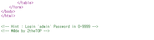 소스코드를 보면 Hind ID admin, PW 0~9999라는 것을 볼 수 있다.