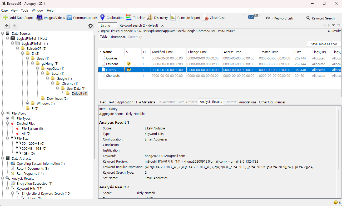 5. AutoPsy의 분석 화면이 열리면 왼쪽 트리의 Data Source에서 추가된 폴더와 파일을 확인한 후, 아래의 사항을 분석한다.