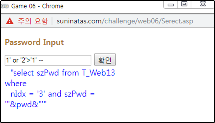 필터링이 되는 것을 확인 후 다른 방법으로 1' or '2'>'1' -- 입력했다.