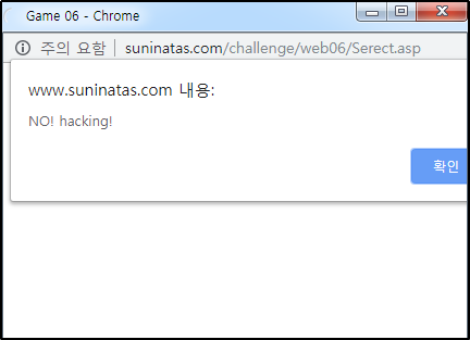 ' or 1=1 -- 입력 시 그림 1-3처럼 No! hacking! 문구를 통해 필터링되는 것을 알 수 있다.