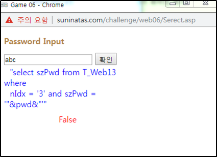그림 1-2을 보면 SQL Injection 공격을 통해 Password를 얻는 것 같다. abc 입력 시 Fasle를 확인할 수 있다.