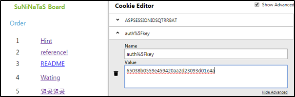 쿠키 변조 후 다시 SQL Injection 공격을 하면 README 게시물을 볼 수 있다.
