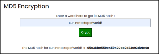 그림 1-7처럼 suninatastopofworld! 문장을 MD5로 암호화 시켰다.