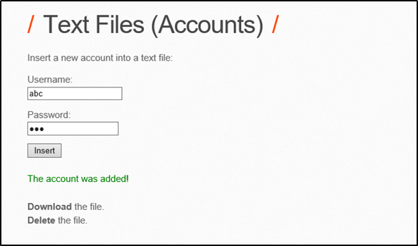 Text Files 문제에 Login abc Password abc를 입력해 계정을 추가했다.