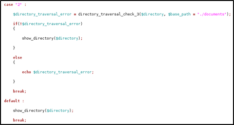 directory 변수에 상대경로를 입력하거나 존재하는 디렉터리를 입력하여도 다른 디렉터리로 이동하지 않는다. 기본 경로는 변수를 사용하여 documents 디렉터리로 한정하고 있어서 상대경로를 입력하여도 다른 디렉터리로 이동이 불가능하다.