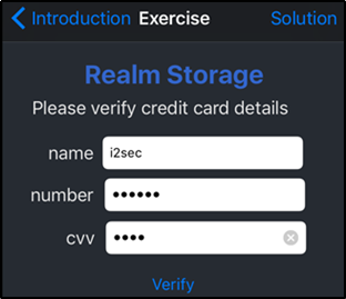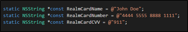 RealmExerciseViewController.m 소스에 CardName, CardNumber, CardCVV 정보를 확인할 수 있다.