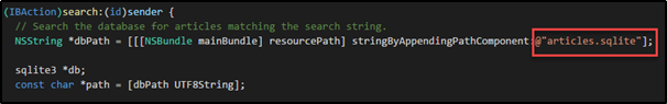 SQLInjectionExerciseController.m 소스 코드를 보면 articles.sqlite 데이터베이스 저장되어 있는 것을 알 수 있다.