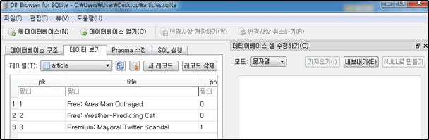DB Browser를 이용해 articles.sqlite 데이터베이스를 열어 기사 3개가 저장되어 있는 것을 알 수 있다.